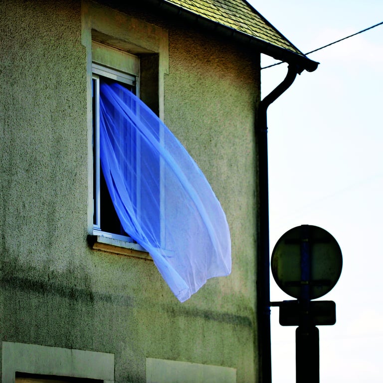 Drôles de vacances, si c’est le cas...Si la balade peut commencer, n'importe où, au nord ou au sud, dans les terres ou en bord de mer, il en est quelques-unes qui sentent l’arrière et la fin de saison. Et si un livre d’été se referme, c’est bien qu’il s’est passé quelque chose. Et lui était là pour en être témoin. Une maison à la grille et aux volets fermés. Une jeune fille de dos seule dans un jardin comme si la fête était finie. Des soleils couchants qui changent d’horizon. Et encore, et aussi et surtout, cette image prise à Dangy. A deux pas de Saint-Lô, elle est un peu le mot “Fin” de cette belle série : deux chaises en plastique posées à l’envers sur une balancelle défraîchie, un chat immobile et des branches mortes.